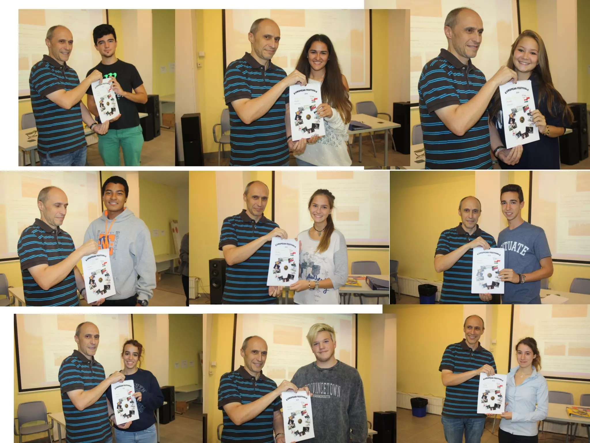 The principal handed out calendars to last year's participants of the Comenius program and presented last year's project to new participants. The meeting involved writing profiles for new Spanish students to be matched with German students for the 2014-2015 Comenius program. There was also a discussion on national versus European identity.