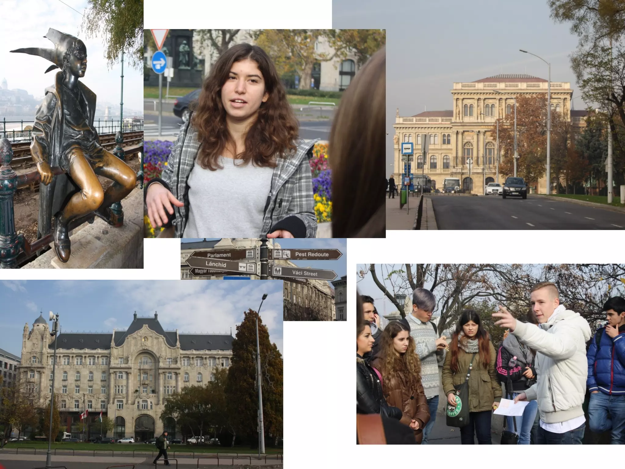 The document appears to be a visual diary of a bilateral meeting that included a long trip, arrival, and first Hungarian meal in Budapest. It also describes a game of bowling before a cultural program, and hosts and guides showing locations like the Castle of Buda.