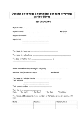 This document is a travel dossier for students to fill out during their trip, including personal information, travel details, and accommodation specifics. It provides a structure for documenting experiences, interactions with host families, and questions related to daily activities and food. Additionally, it includes phrases for communication in English and outlines a timetable for planned activities.