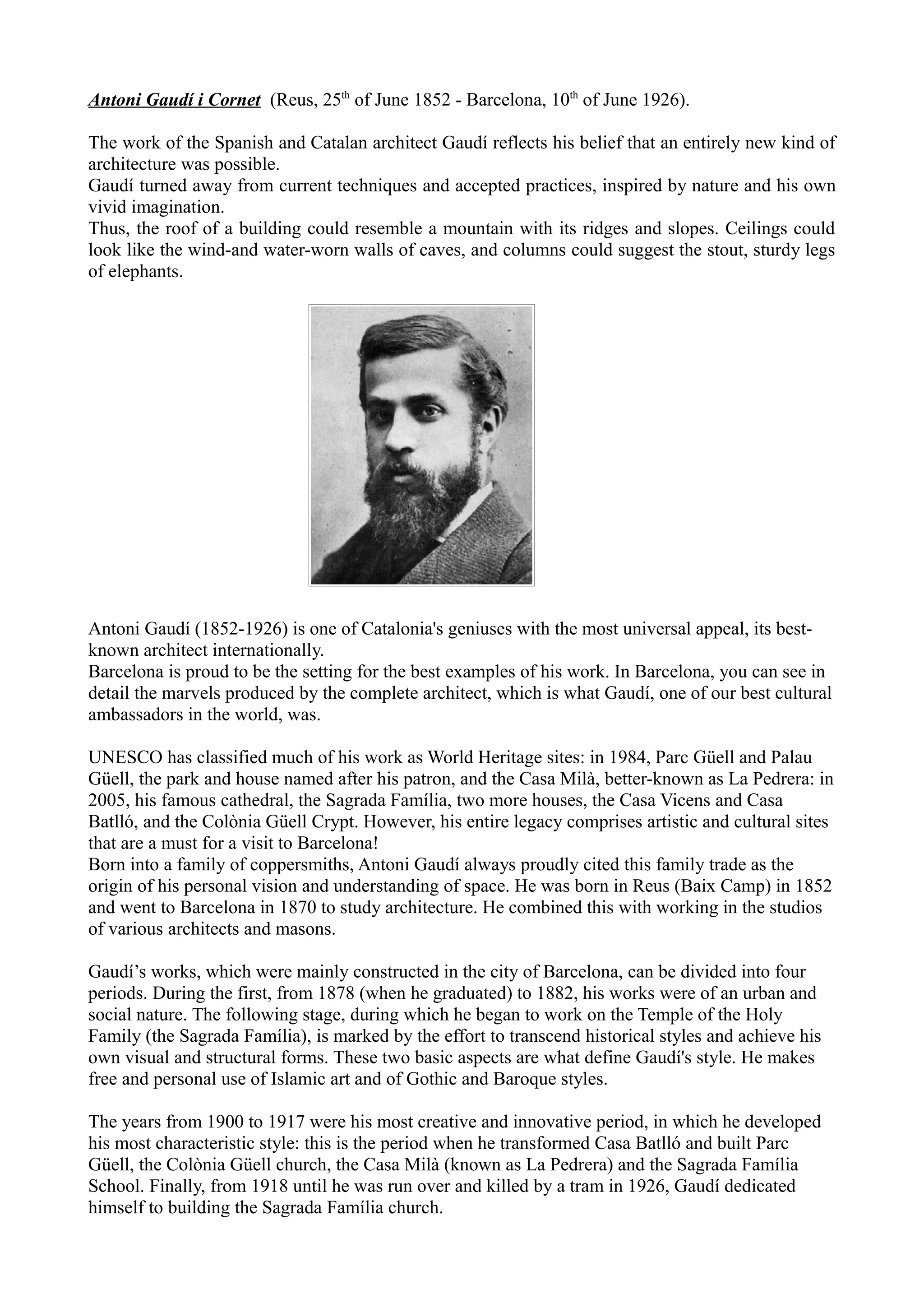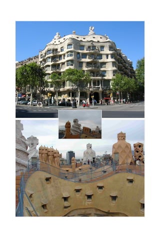The document provides biographical information about renowned Spanish architect Antoni Gaudí. It discusses his innovative architectural style which drew inspiration from nature and rejected conventional techniques. Gaudí's most famous works in Barcelona include Sagrada Família church, Park Güell, Casa Milà, Casa Batlló, and others. It also mentions that much of his work has been classified as UNESCO World Heritage sites and that visiting these landmarks is an essential part of understanding Barcelona's architecture and history.