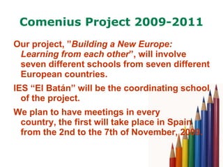 The Comenius project 2009-2011, coordinated by IES 'El Batán', involves seven schools from different European countries, aimed at fostering cross-cultural learning. Students will enhance their knowledge of other nations and improve language and ICT skills, while teachers will share methodologies and enhance teaching quality. Activities include various international meetings, the creation of a website, a dictionary of expressions, and exhibitions to promote collaboration and educational comparison.