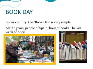 This document summarizes several important festivals and holidays celebrated in Spain. It discusses Book Day in April which promotes reading; Christmas on December 25th which celebrates the birth of Jesus and presents from the Three Wise Men and Santa Claus; Saint John's Day in June which involves bonfires at the summer solstice; Carnival before Lent with costumes and songs; Easter which remembers Jesus' death and resurrection with changing dates; and local fairs throughout Andalusia especially in Seville in April.