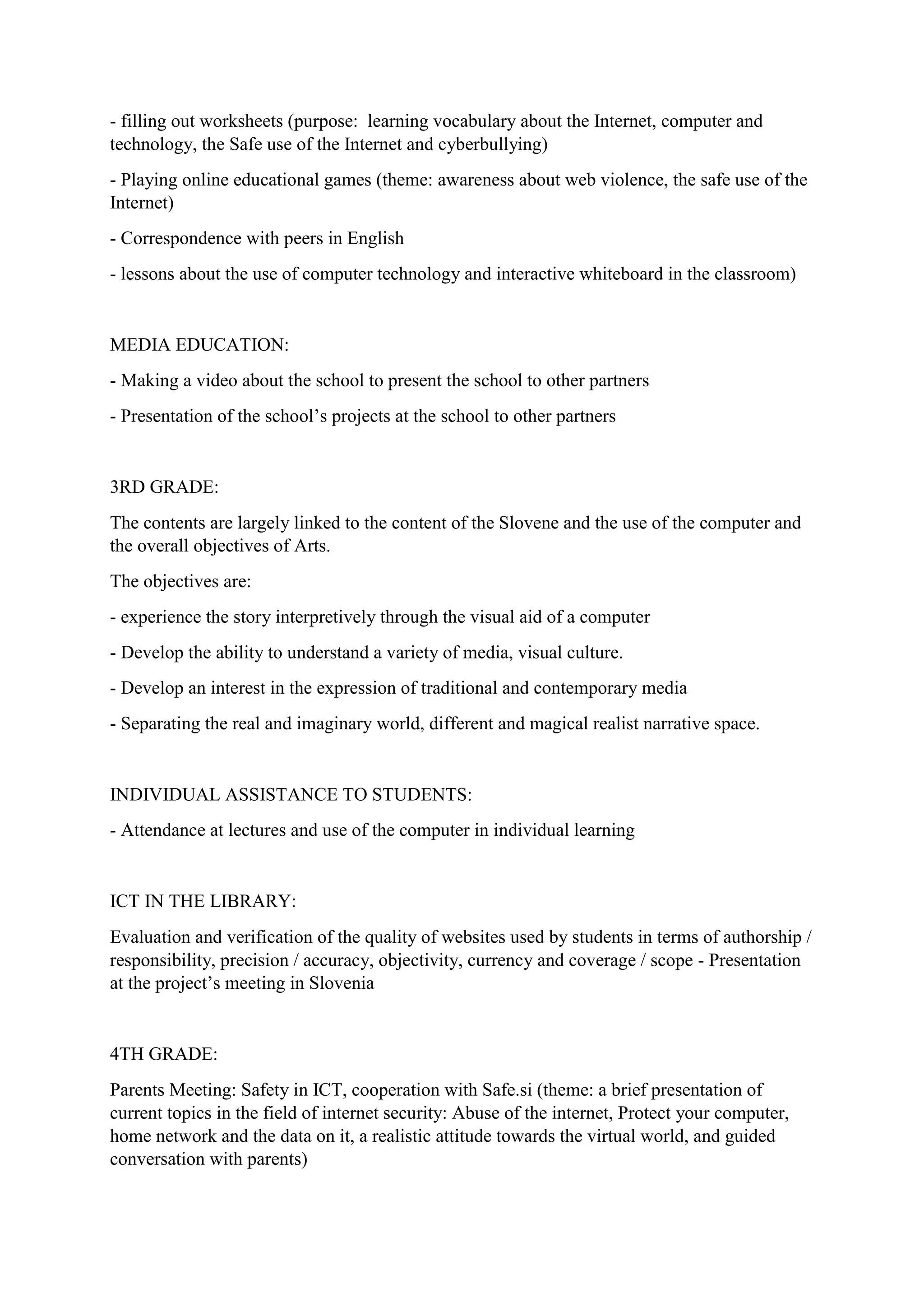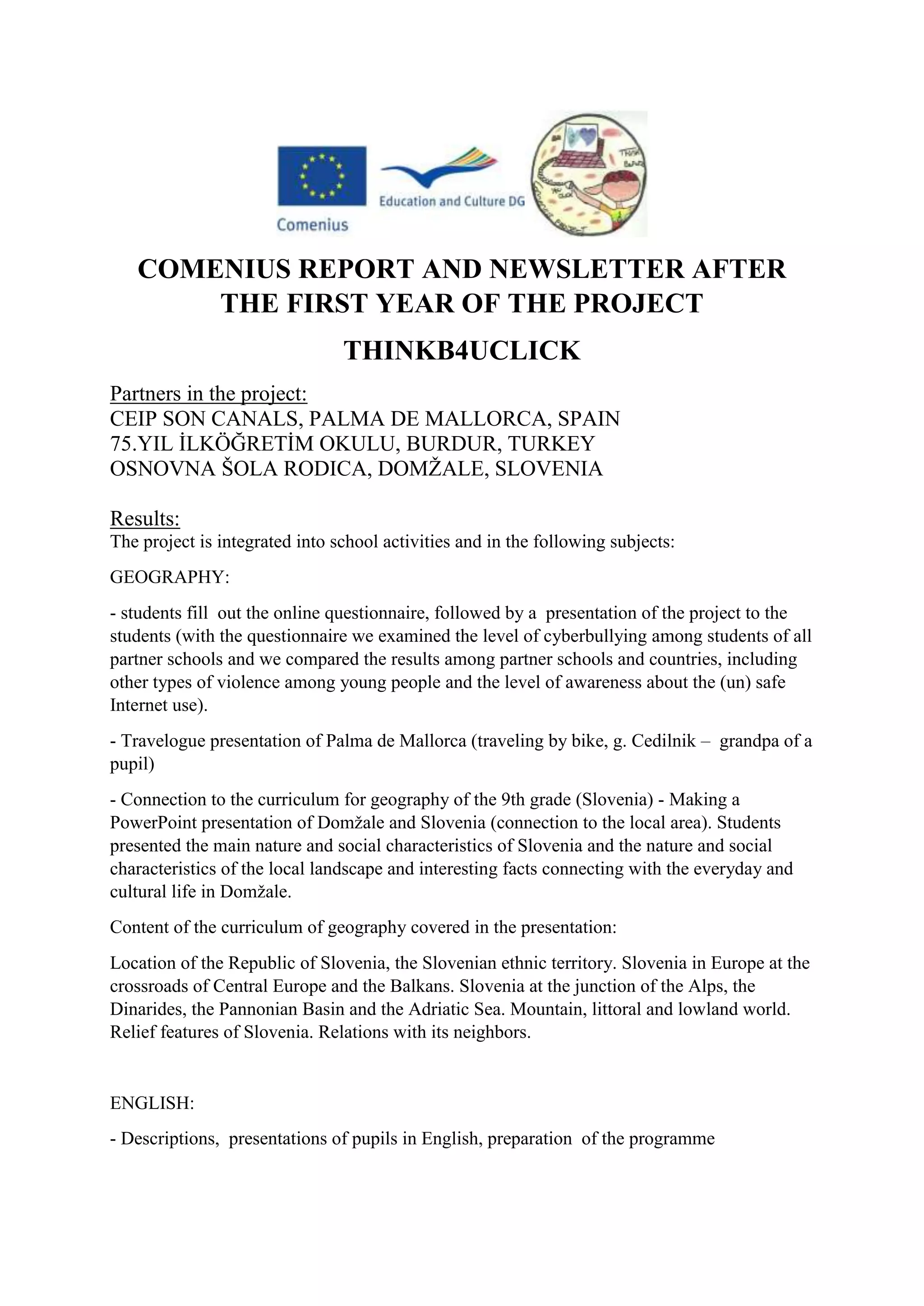 The first year of the ThinkB4UClick project saw collaboration between schools in Spain, Turkey, and Slovenia. Students completed questionnaires on cyberbullying and internet safety. They presented on their countries in subjects like geography, discussed internet usage in English class, and created a video about their school. Students also learned about other cultures, debated technology usage, and created a joint project logo. The project integrated internet safety lessons across many subjects and extracurricular activities.