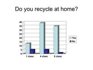 The document contains a series of questions about recycling, reusing resources, and conserving energy and water at home and school. It asks about recycling behaviors, materials recycled, using solar power, turning off water when brushing teeth, saving water, renewable energy sources near the school, and ways students can contribute to caring for the environment at home and school through activities like recycling, not littering, caring for plants, and switching off lights.
