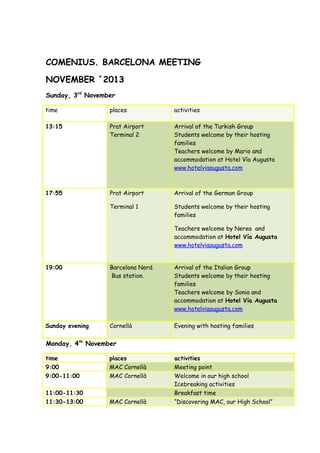 The document provides an itinerary for a Comenius student exchange project taking place in Barcelona, Spain from November 3-9, 2013. It details the arrival times and welcome activities for student groups from Turkey, Germany, Italy and England on the first day. The following days include activities like visiting local schools, landmarks like Sagrada Familia and Montjuich, and free time with host families. The final day includes farewell breakfast and departures for each group.