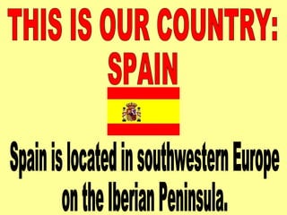 This document provides a tour of Spain and the Cantabria region, highlighting several important locations and features. It describes Spain as a small country with many diverse regions and contrasts. Several iconic Spanish locations are mentioned, including the Alhambra in Granada, Park Güel in Barcelona, and the Roman theatre in Mérida. It then focuses on Cantabria in northern Spain, noting several towns and natural areas like caves and forests. The document concludes with a tour of a school in Cantabria, showcasing the different classrooms and facilities.