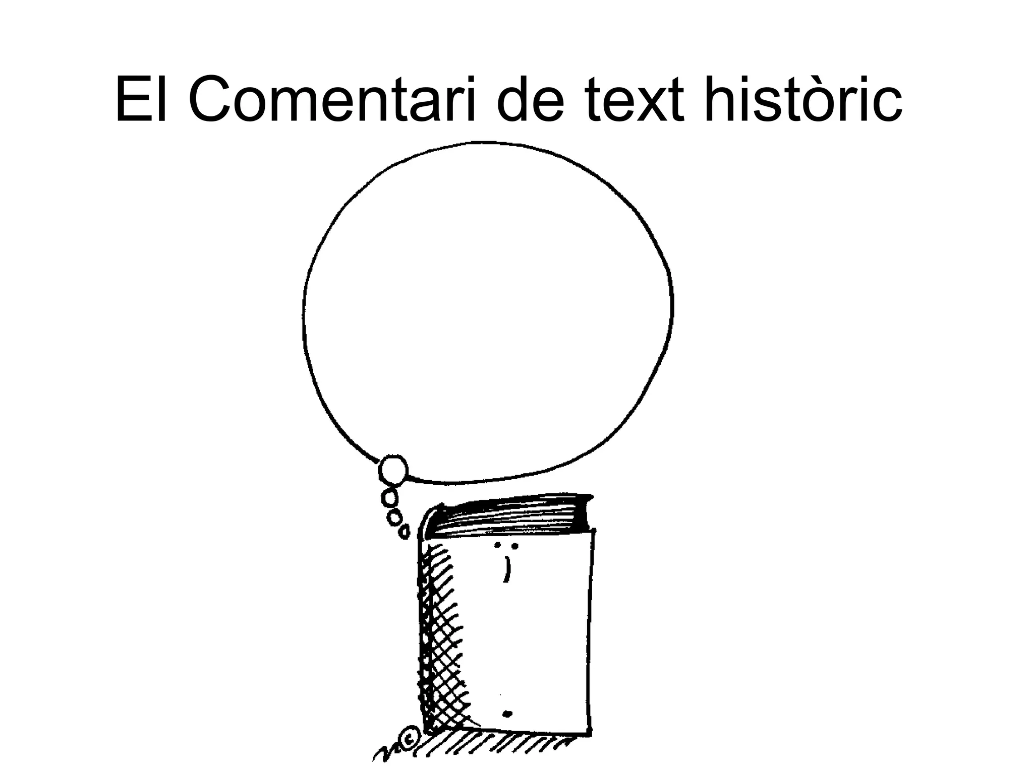 3.Comentari Per tantel comentari t é com a principal objectiu la recerca de les causes, pròximes o remotes que van propiciar l’esdevediment. Ens ajudar an les següents preguntes. Per què va passar? Per qu è dominaven aquestes idees en el moment històric al que fa referència? Quins antecedents hi ha als fets o idees que s’expresen al text? Quines van ser les causes, immediates o llunyanes, dels fets? Quina relació existeix entre els fets que es citen o les idees que s’expresen i la història del seu temps? Quines conseqüències, a curt o llarg plaç, va poder tenir? Farem el comentari centrant-nos en: ·Desvetllar els antecedents. ·Explicar les causes. ·Fer la relaci ó amb la situació històrica del moment. ·Descobrir les possibles conseqüències.