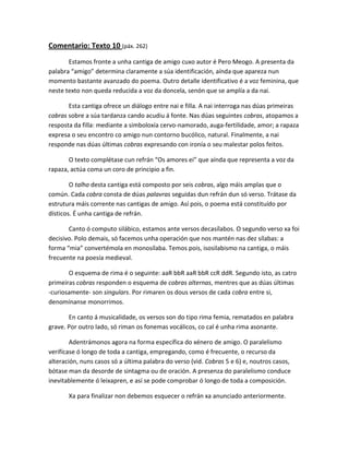Comentario: Texto 10(páx. 262)<br />Estamos fronte a unha cantiga de amigo cuxo autor é Pero Meogo. A presenta da palabra “amigo” determina claramente a súa identificación, aínda que apareza nun momento bastante avanzado do poema. Outro detalle identificativo é a voz feminina, que neste texto non queda reducida a voz da doncela, senón que se amplía a da nai.<br />Esta cantiga ofrece un diálogo entre nai e filla. A nai interroga nas dúas primeiras cobras sobre a súa tardanza cando acudiu á fonte. Nas dúas seguintes cobras, atopamos a resposta da filla: mediante a simboloxía cervo-namorado, auga-fertilidade, amor; a rapaza expresa o seu encontro co amigo nun contorno bucólico, natural. Finalmente, a nai responde nas dúas últimas cobras expresando con ironía o seu malestar polos feitos.<br />O texto complétase cun refrán “Os amores ei” que aínda que representa a voz da rapaza, actúa coma un coro de principio a fin.<br />O talho desta cantiga está composto por seis cobras, algo máis amplas que o común. Cada cobra consta de dúas palavras seguidas dun refrán dun só verso. Trátase da estrutura máis corrente nas cantigas de amigo. Así pois, o poema está constituído por dísticos. É unha cantiga de refrán.<br />Canto ó computo silábico, estamos ante versos decasílabos. O segundo verso xa foi decisivo. Polo demais, só facemos unha operación que nos mantén nas dez sílabas: a forma “mia” convertémola en monosílaba. Temos pois, isosilabismo na cantiga, o máis frecuente na poesía medieval.<br />O esquema de rima é o seguinte: aaR bbR aaR bbR ccR ddR. Segundo isto, as catro primeiras cobras responden o esquema de cobras alternas, mentres que as dúas últimas -curiosamente- son singulars. Por rimaren os dous versos de cada cobra entre si, denomínanse monorrimos.<br />En canto á musicalidade, os versos son do tipo rima femia, rematados en palabra grave. Por outro lado, só riman os fonemas vocálicos, co cal é unha rima asonante.<br />Adentrámonos agora na forma específica do xénero de amigo. O paralelismo verifícase ó longo de toda a cantiga, empregando, como é frecuente, o recurso da alteración, nuns casos só a última palabra do verso (vid. Cobras 5 e 6) e, noutros casos, bótase man da desorde de sintagma ou de oración. A presenza do paralelismo conduce inevitablemente ó leixapren, e así se pode comprobar ó longo de toda a composición.<br />Xa para finalizar non debemos esquecer o refrán xa anunciado anteriormente.<br />