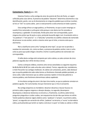 Comentario: Texto 5(páx. 289)<br />Estamos fronte a unha cantiga de amor da autoría de Pero da Ponte, un segrel coñecido polas súas sátiras. A presenza da palabra “desamor” determina claramente a súa identificación; porén, non se di directamente en ningunha palabra que se dirixe á senhor, só hai un “ela” na cuarta cobra, pero si está presente a coita amorosa en todo o poema.<br />Esta cantiga ofrece un xogo poético, un finximento, no que o autor emprega un suxeito lírico namorada e cunha gran coita porque a súa dama non lle concedeu a recompensa, o galardón. O namorado, ferido polo amor non correspondido, quere vingarse da senhor que lle quita o sono; pretende buscarlle algún mal. A oscilación entre o “eu podesse“ / “non poss’eu” e o “(ela) deu” presentes no subliña o desexo do namorado de provocar na súa senhor, senón o mesmo amor que el sinte, a mesma coita que o atormenta.<br />Non a clasificaría como unha “cantiga de amor tipo”, xa que non se percibe a vasalaxe do namorado, nin, como xa dixen, a presenza da palabra senhor; mais si unha coita ou pena que pode chegar a levarlle a morte ó suxeito poético do namorado non correspondido.<br />O talho desta cantiga está composto por catro cobras, as cales constan de cinco palavras seguidas dun refrán de dous versos.<br />Canto o cómputo silábico, estamos ante versos octosílabos co seguinte esquema: 8a 8b 8a 8b 8c 8A 8C (en cada unha das catro cobras). Temos, segundo isto, isosilabismo, o máis frecuente nas cantigas medievais. As cobras son unissonans, porén, cabe destacar que na quinta palabra de cada cobra temos un fenómeno chamado palabra perduda, un verso solto. Cabe mencionar que as cobras sucesivas repiten ó inicio das palavras a mesma palabra, este fenómeno denomínase cobras capdenals.<br />A rima desta cantiga de amor é do tipo rima macho, xa que as palavras rematan en palabras agudas. Por outra banda, hai que mencionar que a rima é consoante.<br />Na cantiga atopamos os mordobres: desamar-desamou e buscar-buscou na primeira cobra; enganar-enganou e desejar-desejou, na segunda; desamparar-desamparou e destorvar-destorvou na terceira; e, finalmente, na última cobra temos preguntar-preguntou e cuidar-cuidou, sen esquecernos do dar-deu que temos no refrán. Tamén podemos observar algúns dobres como: ‘podesse’ e ‘sempre’, na primeira cobra, ‘posso’, na segunda con variación do refrán; ‘podesse’ na terceira; e ‘nunca’ na derradeira cobra, puntualizando que tamén se repite a estrutura ‘a quen’ en todas as cobras e refrán.<br />A presenza de refrán clasifica á cantiga como cantiga de refrán. O refrán que aquí temos é moi peculiar: existen dúas variantes que se alternan. Na primeira e terceira cobra temos o refrán “se eu podesse coita dar, a que mi sempre coita deu” e na segunda e na cuarta atopamos a variante “porque non poss’eu coita dar, a que mi sempre coita deu”.<br />