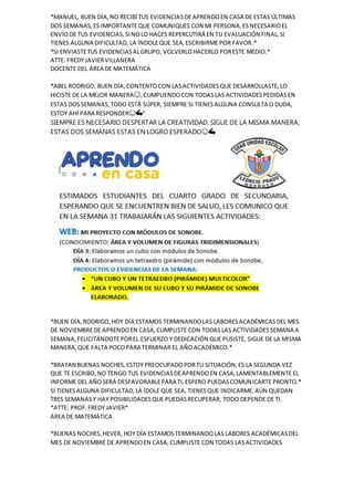 The document contains messages from a teacher to various students regarding their schoolwork activities and assignments. The teacher praises and encourages students who have submitted their assignments on time, and reminds others who are missing assignments to submit them to avoid it negatively impacting their grades. The teacher provides their contact information and offers help to students facing any difficulties.