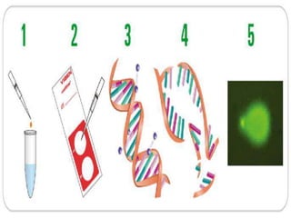 The comet assay, also known as single cell gel electrophoresis, is a sensitive technique for detecting DNA damage in individual cells. It involves lysing cells embedded in agarose on a microscope slide, allowing damaged DNA to migrate towards the anode during electrophoresis. This forms structures resembling comets that are visualized by fluorescence microscopy. The amount of DNA in the comet tail relative to the head indicates the number of DNA breaks, allowing quantification of DNA damage. The comet assay has applications in genotoxicity testing, environmental monitoring, human biomonitoring, nutritional studies, and measuring DNA repair capacity.