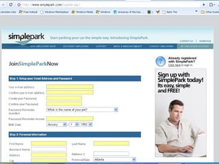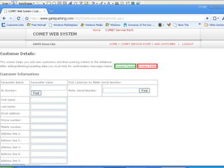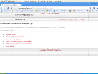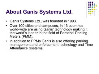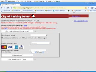 The COMET system provides a personal parking meter called the COMET that allows users to pay for street parking using their mobile phone or computer. Key features include only paying for actual parking time, easy enforcement through the COMET's display or wireless connection, and a backend system that municipalities can use to manage payments and parking rules. The COMET is small, lightweight, and easy for users to operate from their vehicle without handling cash.