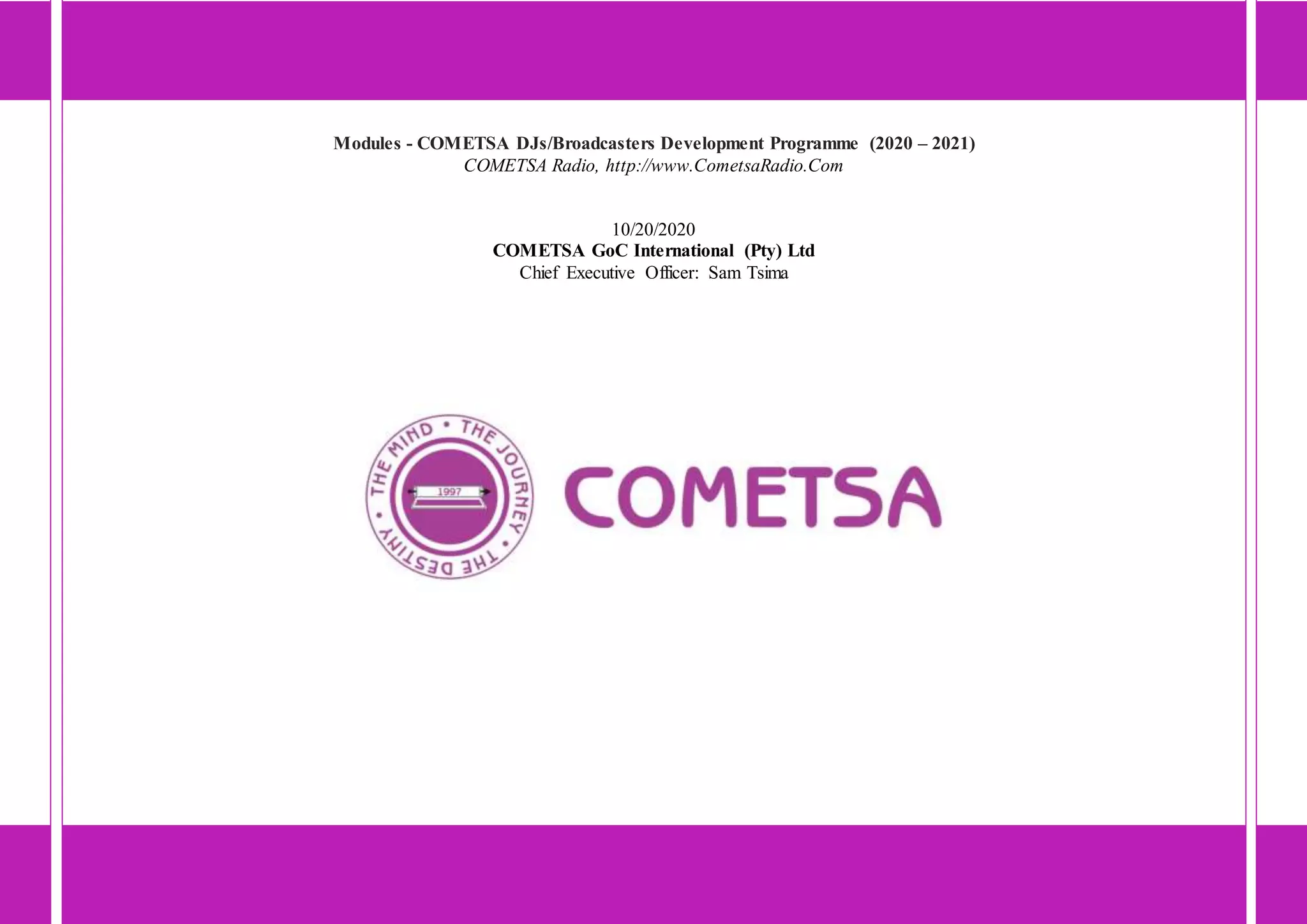This document outlines modules and lectures for a DJ/broadcaster development programme by COMETSA Radio. It covers topics like introduction to programmes, roles and self-development, proper conduct during shows including introducing guests and facilitating conversations, promoting shows and making podcasts go viral. The programme aims to develop participants' skills as effective radio hosts through lectures and discussions on technical and soft skills over 8 modules from October 2020 to May 2021.