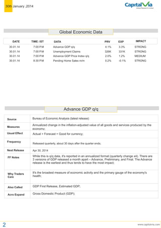 The Global Research Limited Comex report from January 30, 2014, highlights economic indicators including GDP growth, unemployment claims, and pending home sales, with data showing strong economic performance. Gold prices experienced fluctuations due to market uncertainties, while silver and copper also showed price movements affected by emerging market conditions and US Federal Reserve policy adjustments. Additionally, crude oil inventories increased significantly, impacting price trends amid changing supply dynamics.