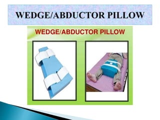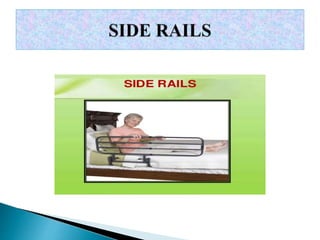 This document discusses various comfort devices used to provide comfort to patients. It describes pillows, back rests, hand rolls, foot rests, knee rests, sand bags, air/water mattresses, rubber/cotton rings, bed cradles, bed blocks, air cushions, cardiac tables, side rails, wedge/abductor pillows, and trapeze bars. For each device, it provides details on how it is constructed and its purpose in maintaining patient alignment, reducing pressure, and adding to physical comfort. The overall goal of comfort devices is to enhance patient satisfaction and health outcomes.