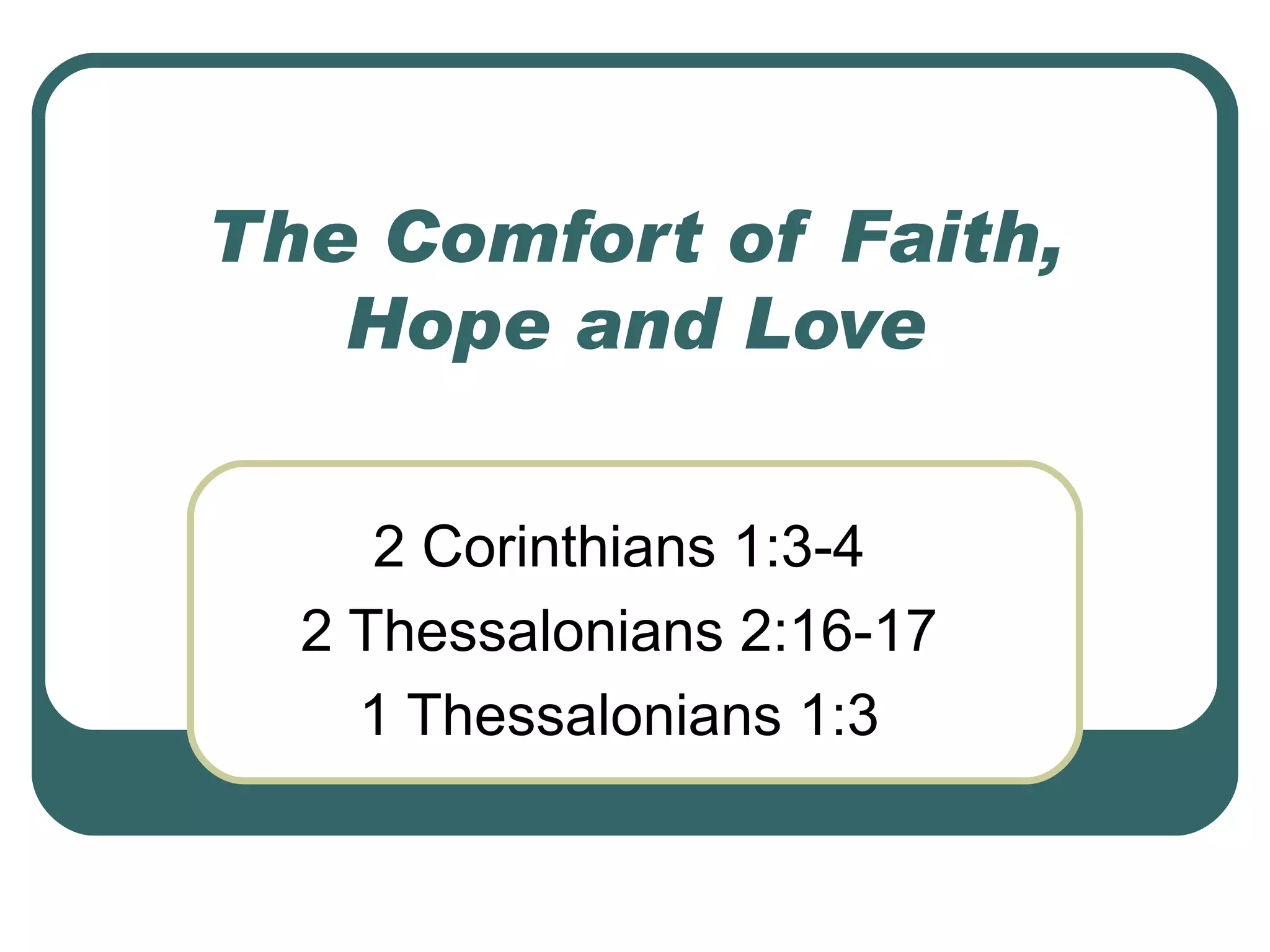 This document discusses the comfort that faith, hope, and love can provide based on passages from the Bible. It explains that having faith in God and His promises allows one to comfort others during difficult times. It also notes that hope for a brighter future based on God's word provides real comfort. Additionally, love is comforting because it promotes unity among believers and allows them to support and correct one another.
