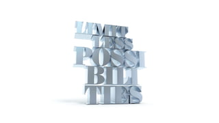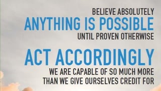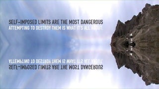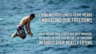 The document discusses becoming limitless by overcoming self-doubts and unleashing one's potential. It suggests accepting lessons without mistakes, focusing on learning through repetition in the present. Visualizing a limitless character and governing values can help eliminate anxiety and transcend one's comfort zone, ultimately finding personal fulfillment and making a positive difference.