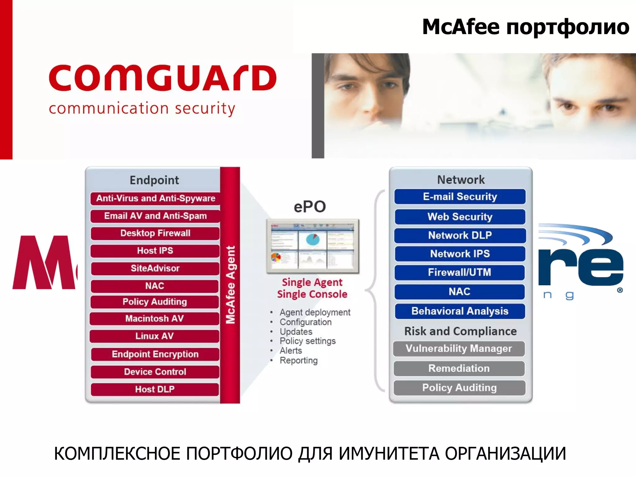 Документ представляет комплексное портфолио продуктов безопасности McAfee, включая решения для сетевой защиты, фильтрации веб-контента, защиты электронной почты и анти-малварных технологий. Упоминается высокая эффективность продукции, победы в тестах и уникальные возможности, такие как фильтрация SSL-трафика и интеграция нескольких антивирусных движков. McAfee выделяется как лидер в области кибербезопасности согласно отчетам Gartner.