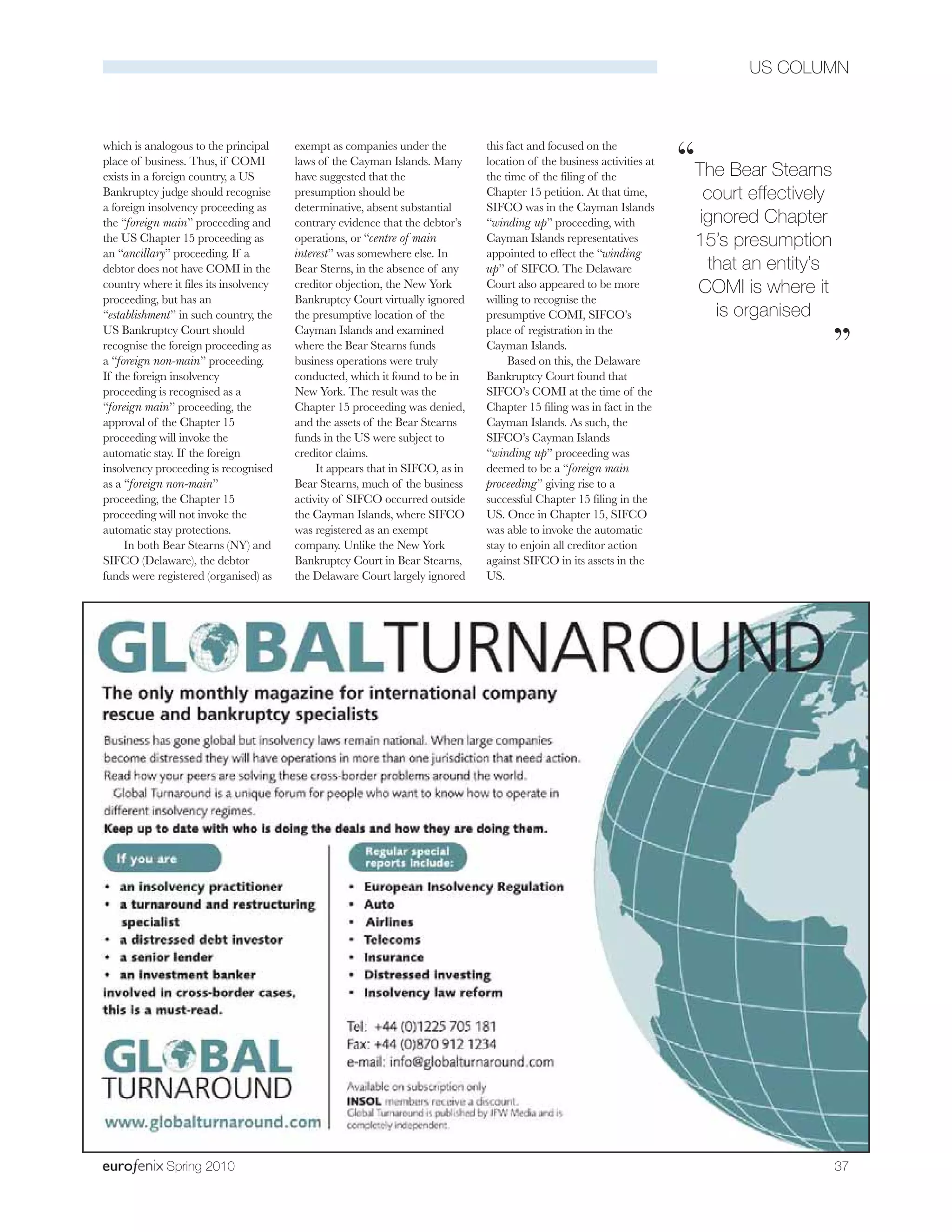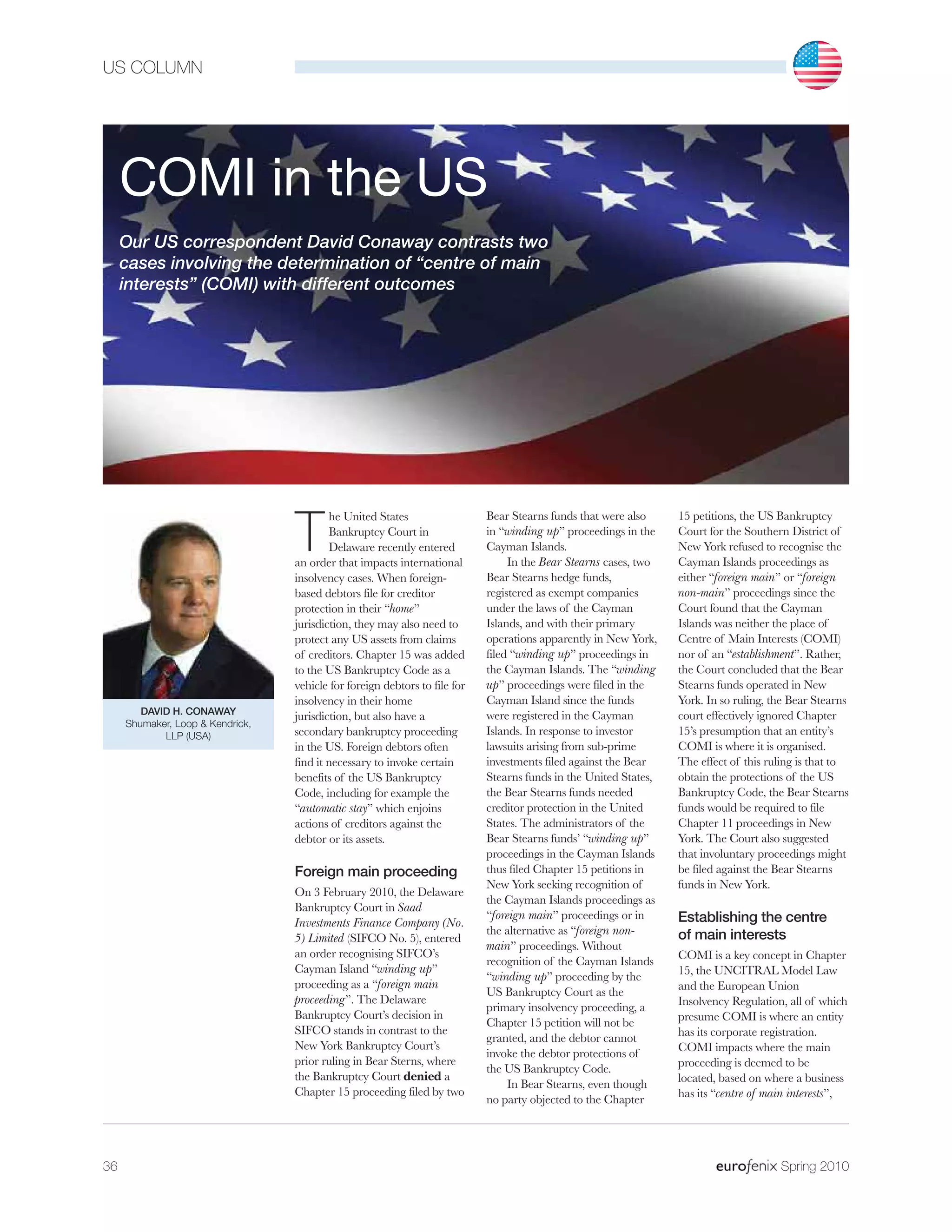 The document discusses two US bankruptcy court cases - Bear Sterns and SIFCO - that dealt with determining the "centre of main interests" (COMI) of foreign companies filing for insolvency protection. In Bear Sterns, the NY bankruptcy court denied recognizing the Cayman Islands winding up proceedings as the foreign main proceeding, as it determined the hedge funds' COMI was in New York, not Cayman Islands. In contrast, the Delaware bankruptcy court in SIFCO recognized the Cayman Islands winding up proceeding as the foreign main proceeding, focusing on the location of activities at the time of filing rather than historical business activities. The determination of a company's COMI is important for whether foreign insolvency proceedings can be