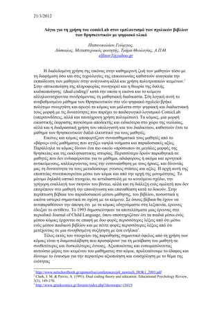 21/3/2012 Λόγοι για τη χρήση του comicLab στον εμπλουτισμό των σχολικών βιβλίων των θρησκευτικών με ψηφιακό υλικό Παπανικολάου Γεώργιος, Δάσκαλος, Μεταπτυχιακός φοιτητής, Τμήμα Θεολογίας, Α.Π.Θ. elfinor3@yahoo.gr Η διαδεδομένη χρήση της εικόνας στην καθημερινή ζωή των μαθητών τόσο με τη διαφήμιση όσο και στις τεχνολογίες της επικοινωνίας καθιστούν αναγκαία την εκπαίδευση των μαθητών στην ανάγνωση αλλά και χρήση πολυτροπικών κειμένων.1 Στην οπτικοποίηση της πληροφορίας συνηγορεί και η θεωρία της διπλής κωδικοποίησης (dual coding)2 κατά την οποία η εικόνα και το κείμενο αλληλοενισχύονται συνδράμοντας τη μαθησιακή διαδικασία. Στη λογική αυτή το αναβαθμισμένο μάθημα των Θρησκευτικών στο νέο ψηφιακό σχολείο βρήκε πολύτιμο συνεργάτη και αρωγό τα κόμικς και μάλιστα στην ψηφιακή και διαδικτυακή τους μορφή με τις δυνατότητες που παρέχει το παιδαγωγικό λογισμικό ComicLab (υπερσυνδέσεις, αλλά και ταυτόχρονη χρήση πολυμέσων). Τα κόμικς, μια μορφή εικαστικής έκφρασης παγκόσμια αποδεκτής και ειδικότερα στο χώρο της νεολαίας, αλλά και η διαδραστική χρήση του υπολογιστή και του διαδικτύου, καθιστούν έτσι το μάθημα των θρησκευτικών διπλά ελκυστικό για τους μαθητές. Εικόνες και κόμικς αποφορτίζουν συναισθηματικά τους μαθητές από το «βάρος» ενός μαθήματος που αγγίζει υψηλά νοήματα και παραδοσιακές αξίες. Παράλληλα τα κόμικς δίνουν ένα πιο οικείο «πρόσωπο» σε μεγάλες μορφές της θρησκείας και της εκκλησιαστικης ιστορίας. Περισσότερο δρούν παρωθητικά σε μαθητές που δεν ενδιαφέρονται για το μάθημα, αδιάφορους ή ακόμα και αρνητικά αντικείμενους, καλλιεργώντας τους την ενσυναίσθηση με τους ήρωες, και δίνοντάς μας τη δυνατότητα να τους μεταδώσουμε γνώσεις στάσεις και αξίες. Η αρχή αυτή της εποπτείας συνεπικουρείται μέσω των κόμικ και από την αρχή της μονιμότητας. Το μόνιμο δηλαδή οπτικό στοιχείο, σε αντιδιαστολή με το κινούμενο σχέδιο, την γρήγορη εναλλαγή των σκηνών του βίντεο, αλλά και τη διάλεξη ενός ομιλητή που δεν επιτρέπουν στο μαθητή την επανάγνωση και επαναθέαση κατά το δοκούν. Στην περίπτωση βέβαια του παραδοσιακού μέσου μάθησης, του βιβλίου, ποσοστικά η εικόνα υστερεί σημαντικά σε σχέση με το κείμενο. Σε όσους βέβαια θα έχουν να αντιπαραθέσουν την άποψη ότι με τα κόμικς οδηγούμαστε στη λεξιπενία, έρευνες έδειξαν το αντίθετο. Το 1993 δημοσιεύτηκαν τα αποτελέσματα μιας έρευνας στο περιοδικό Journal of Child Language, όπου υποστηριζόταν ότι τα παιδιά μέσω ενός μέσου κόμικς έρχονται σε επαφή με δυο φορές περισσότερες λέξεις από ότι μέσω ενός μέσου παιδικού βιβλίου και με πέντε φορές περισσότερες λέξεις από ότι μετέχοντας σε μια συνηθισμένη συζήτηση με ένα ενήλικα3. Τέλος εκτός του στοιχείου της παρώθησης σημαντικό όφελος από τη χρήση των κόμικς είναι η διαμεσολάβηση που προσφέρουν για τη μετάβαση του μαθητή σε συνθετότερες και δυσκολότερες έννοιες. Αξιοποιώντας και ενσωματώνοντας αυτούσιο μέρος του κειμένου του μαθήματος στο κόμικ, προλειαίνουμε το έδαφος και δίνουμε το έναυσμα για την περαιτέρω αξιοποίηση και ενασχόληση με το θέμα της ενότητας 1 http://www.netschoolbook.gr/epimorfosi/conferences/p4_newtech_DOK1_2003.pdf 2 Clark, J. M. & Paivio, A. (1991). Dual coding theory and education. Educational Psychology Review, 3(3), 149-170. 3 http://www.greekcomics.gr/forums/index.php?showtopic=19419