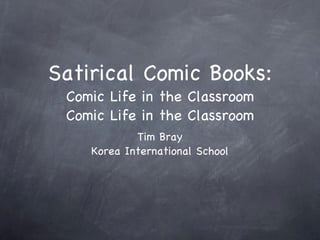 This document discusses using satirical comic books in the classroom to teach students about satire and social issues. It introduces a challenge where students create their own satirical comic books mocking problems in society to induce change or reflection. Examples of student comic books included ones about regrets, being thin, dysfunctional families, and what a successful life looks like. The document provides contact information for the author who implemented a challenge having students make satirical comic books.