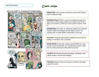 Comic strips can be created using the online tool Bitstrips, which allows users to design characters, place them in amusing situations, and share the comics on social media. The document discusses using comic strips in education to foster students' writing skills in an engaging way, with the goal of improving interaction between learners and motivating them to create their own comics and practice writing unconsciously. Creating comics digitally with Bitstrips also helps reduce paper usage.