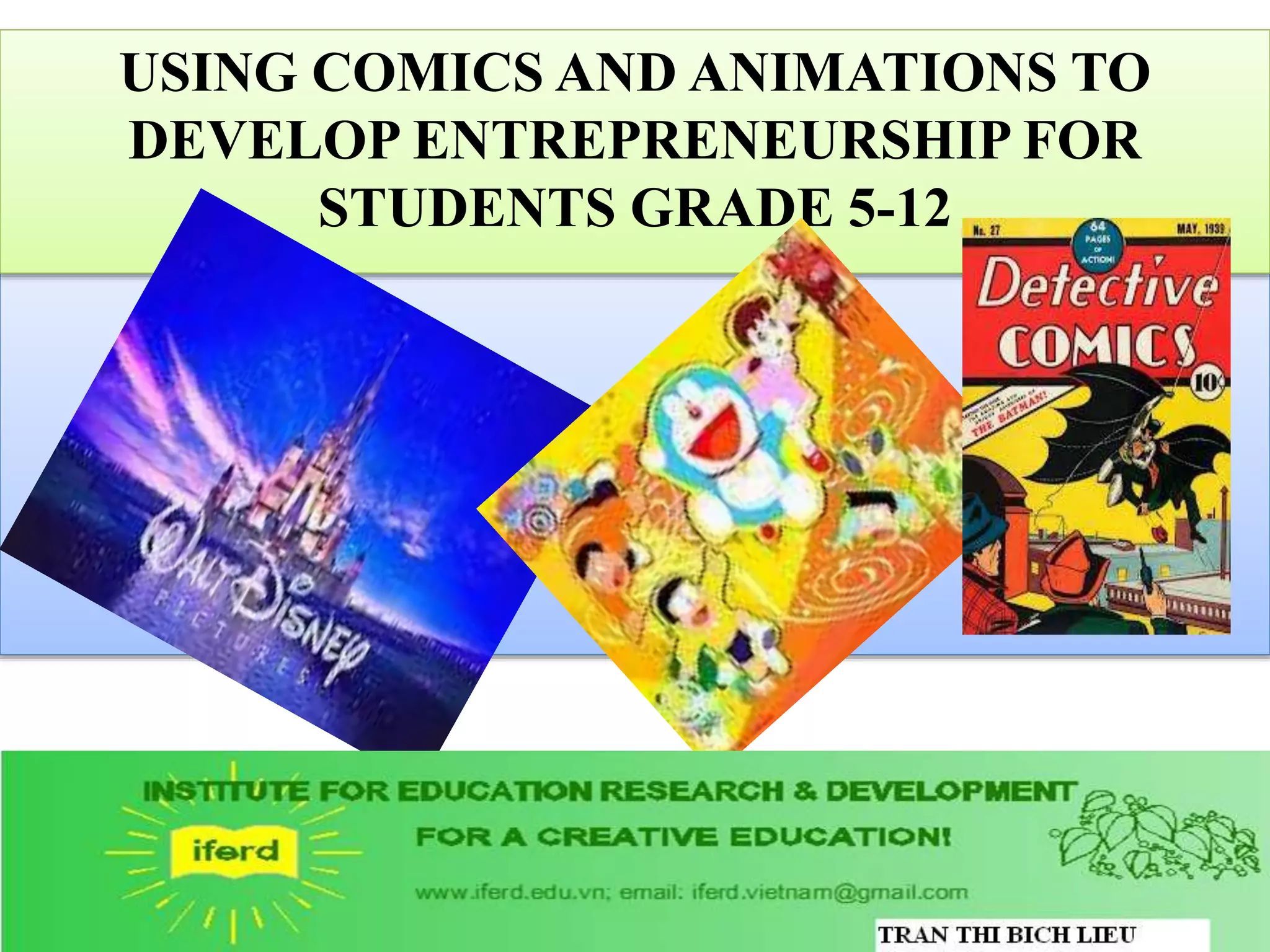 The document discusses using comics and animations to teach entrepreneurship to students in grades 5-12, detailing various techniques and activities that can enhance learning and creativity. It emphasizes the importance of tailored assignments and role-play to help students develop business skills, while noting the advantages of using comics, especially in areas with limited access to technology. Additionally, the document outlines a call for support in areas such as funding and comic artistry to expand this educational initiative for ethnic minority and rural students in Vietnam.