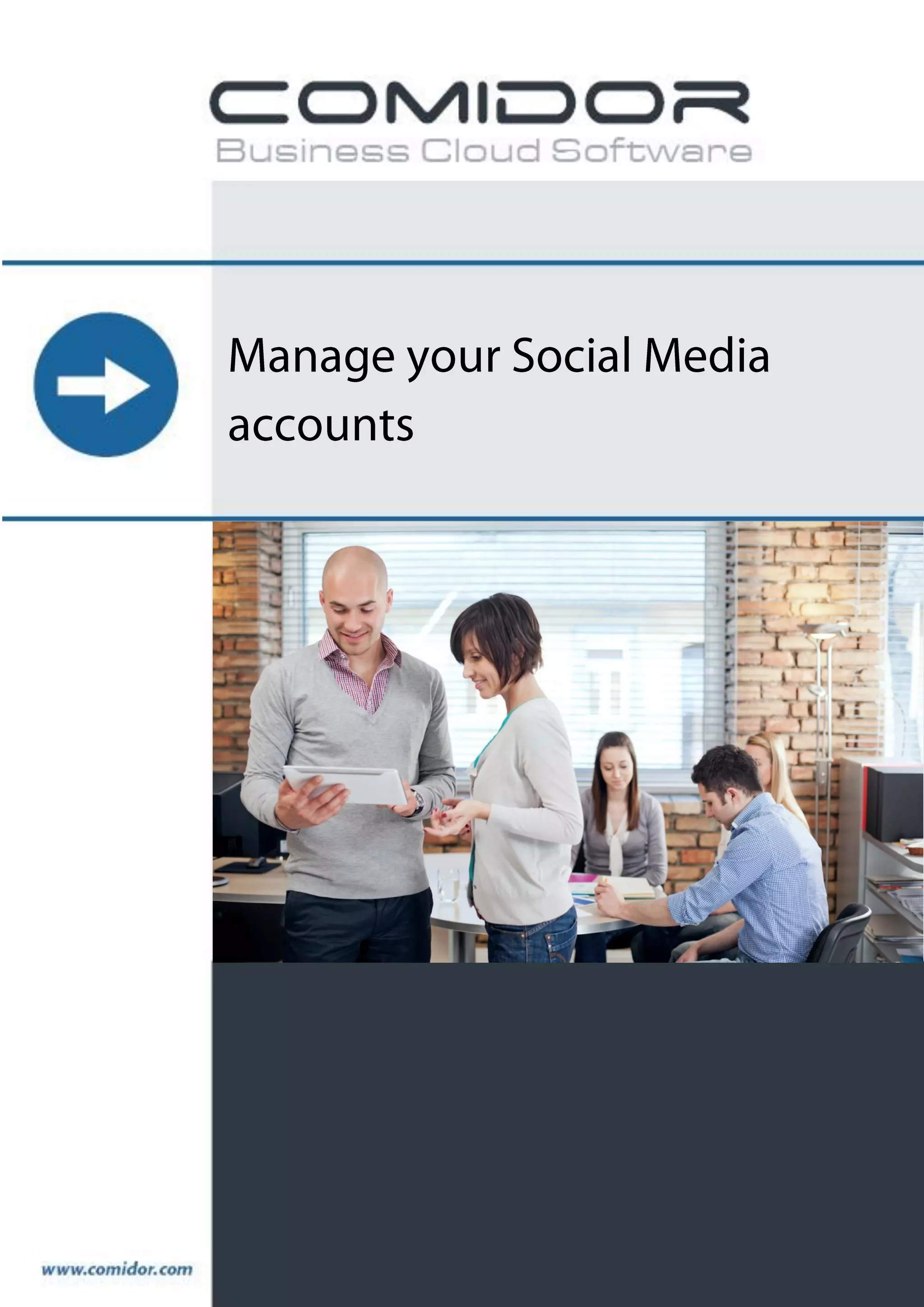 The document provides a guide for managing Twitter and LinkedIn accounts through Comidor's interface. It outlines steps for connecting accounts, composing tweets or updates, searching for content, scheduling tweets, and performing actions related to contacts and companies on LinkedIn. Users can also save posts as notes and easily log out from their accounts.