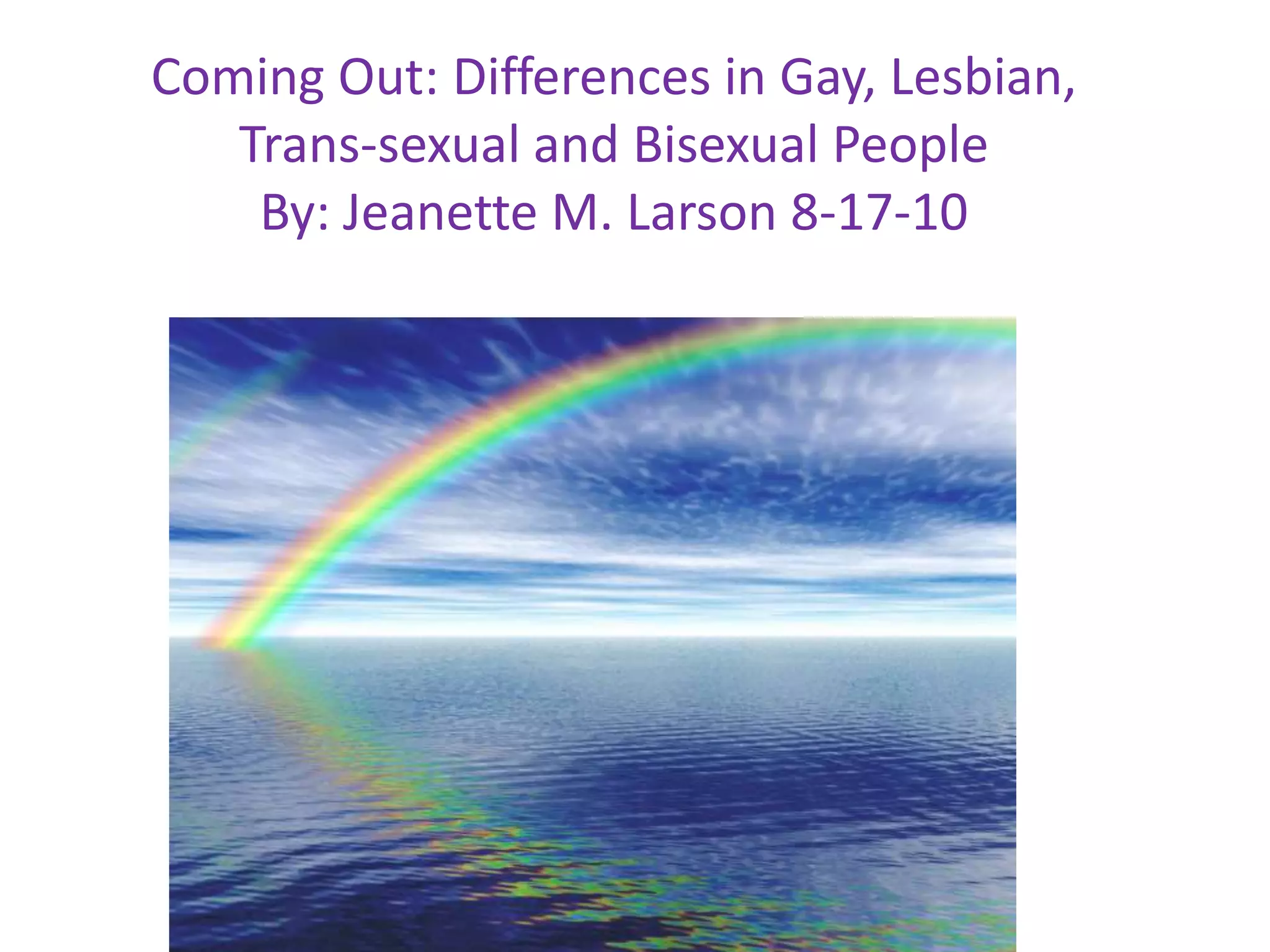 This document discusses several studies related to coming out experiences for LGBTQ individuals. It summarizes findings that disclosure of sexual orientation often helps with relationship building and self-esteem, but also carries risks due to potential stigma. One study found that responses from family members upon coming out included support through actions, support to preserve family bonds, avoidance, and distancing. The document also describes the author's survey of LGBTQ youth, finding that responses upon coming out were most often supportive, though the sample size was small.