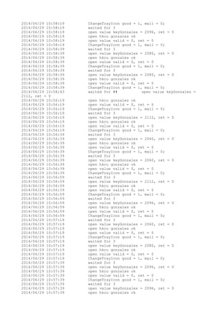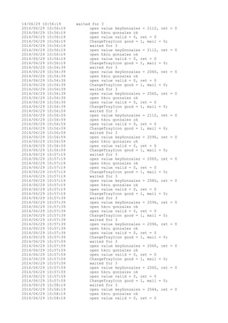 Documentul conține înregistrări de operațiuni ce au avut loc la 29 iunie 2014, în care se deschid valori asociate cu cheia 'gonzales' și se verifică validitatea acestora. Rezultatul operațiunilor indică succesul deschiderii valorilor, dar cu un status de validitate de 0. În plus, iconița din sistem este modificată în mod repetat, fără a se observa probleme de conexiune sau erori.