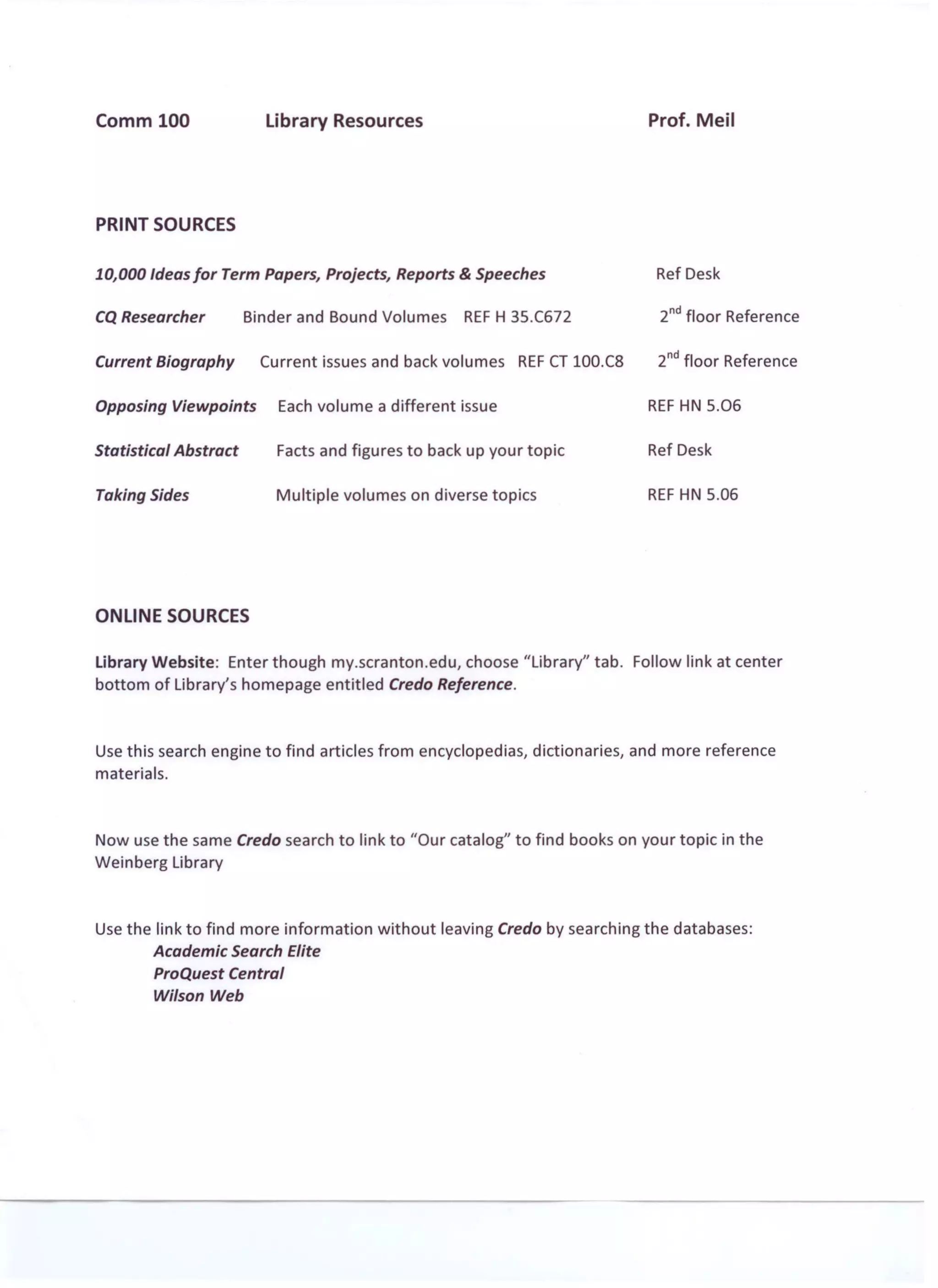 This document provides a list of print and online library resources for students in Comm 100 to use for their term papers, projects, reports, and speeches. It identifies reference books located on the 2nd floor reference section and statistical databases available. It also provides instructions on how to access the library website and use the Credo Reference search engine to find encyclopedia articles and search the library catalog and databases for additional information on topics.