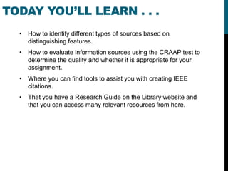 3) The different types of resources like scholarly journals, popular magazines, and trade journals; and how to determine their credibility using the CRAAP test.