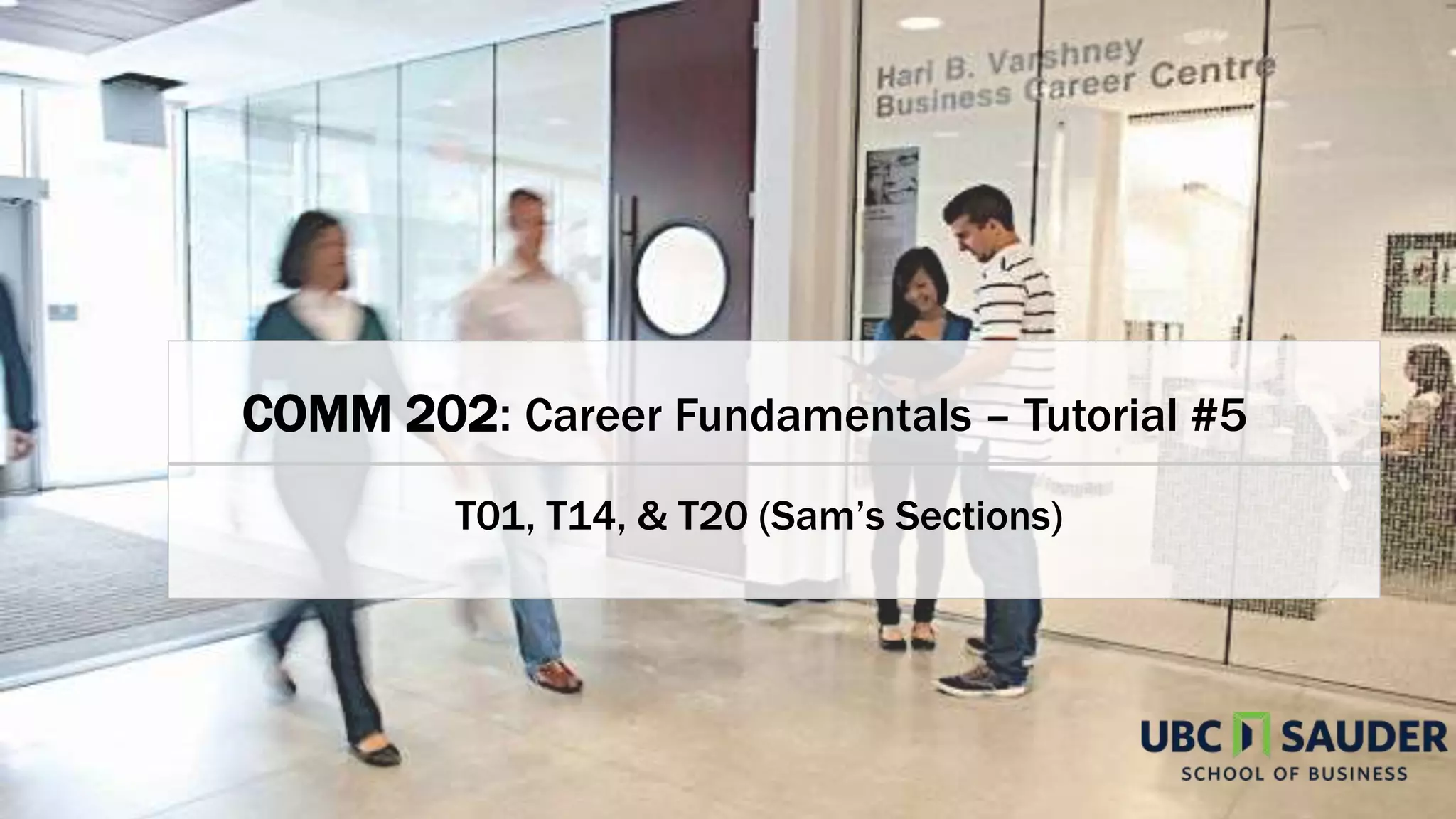 This document provides an agenda and announcements for a career fundamentals tutorial. It outlines the schedule for peer review of resumes and cover letters, discusses networking basics, and previews upcoming assignments. Details are given on how to structure and write effective resumes, cover letters, and networking reflections. Office hours for one-on-one assistance are also announced.