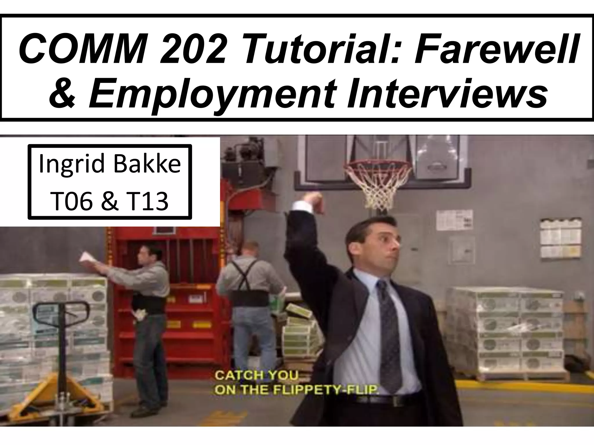 The document provides an agenda and details for COMM 202 students' final tutorial, which focuses on preparing for employment interviews. It outlines the schedule for upcoming mock interviews and assignments. The tutorial covers common interview questions, tips for answering questions about strengths, weaknesses, past experiences, and unexpected questions. Students are encouraged to practice their responses using the STARL method and with a partner. The document emphasizes being prepared, arriving on time, following dress code, sending a thank you note, and utilizing campus resources for additional interview help and practice.