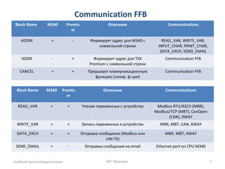 Документ описывает функции и особенности построения распределенных систем автоматизации на базе контроллеров Modicon M340 и TSX Premium. Он включает описание различных коммуникационных функций, таких как чтение и запись переменных, отправка сообщений и управление параметрами. Также рассматриваются синхронные и асинхронные функции, их вызов и управление через специфические параметры.