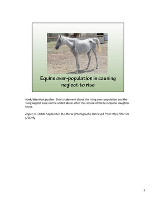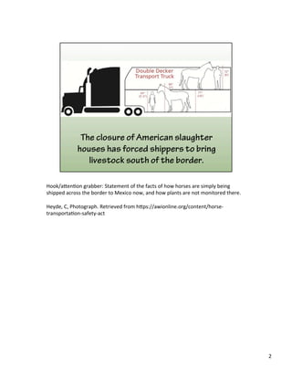 This document provides an outline for an argument that horse slaughter, while unpleasant, is a more humane alternative to neglect and starvation. It begins with an attention-grabbing statement about overpopulation and neglect cases rising after the closure of US slaughterhouses. It then notes that horses are now shipped to Mexico for slaughter where facilities are unregulated. The main idea is presented that while unpleasant, slaughter is preferable to neglect and starvation that many horses now face. Supporting points discuss how slaughter could be made humane if regulated in the US, and how rescues are overwhelmed by the equine population. The document calls on readers to support reopening regulated US slaughterhouses to prevent animal suffering.