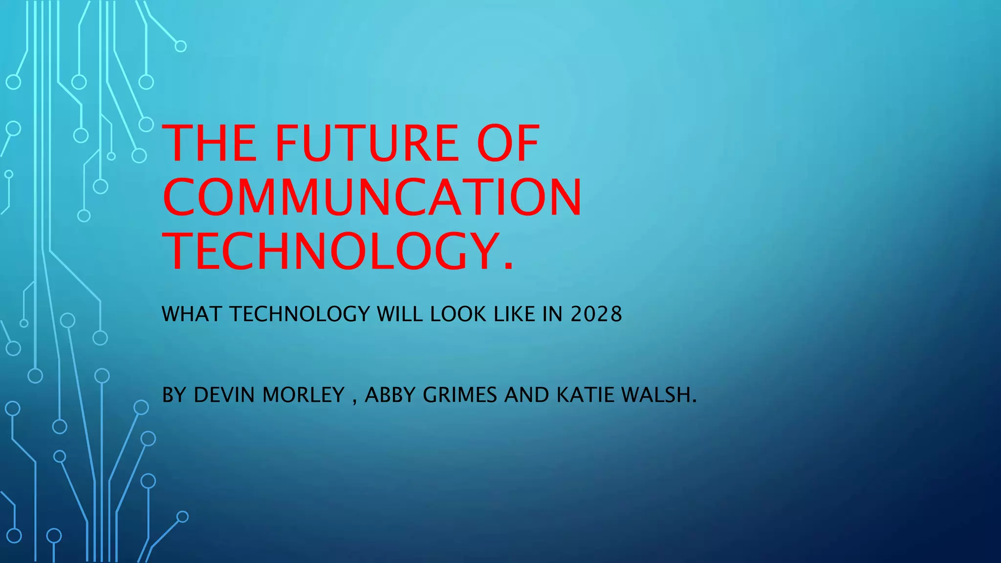 This document discusses predictions for the future of communication technology in 10 years, or by 2028. It suggests that classrooms will increasingly utilize technology like iPads and projectors, with fewer printed books. 3D printing will allow on-demand manufacturing of physical items. Driverless cars are predicted to be common by 2028 and safer than human-driven vehicles. Streaming services and online shopping will provide even faster gratification. People will grow more reliant on media through virtual reality and mobile access, increasing media's influence.
