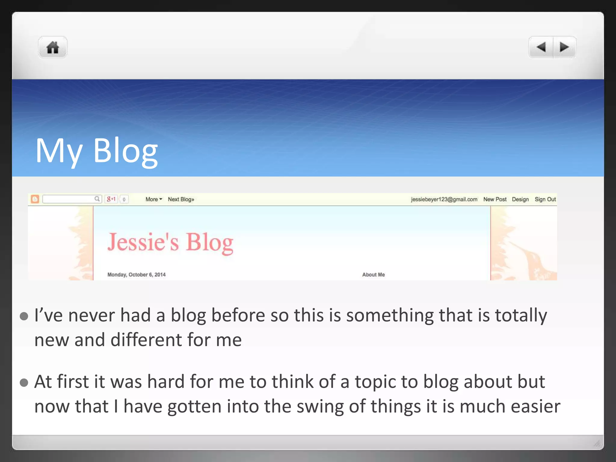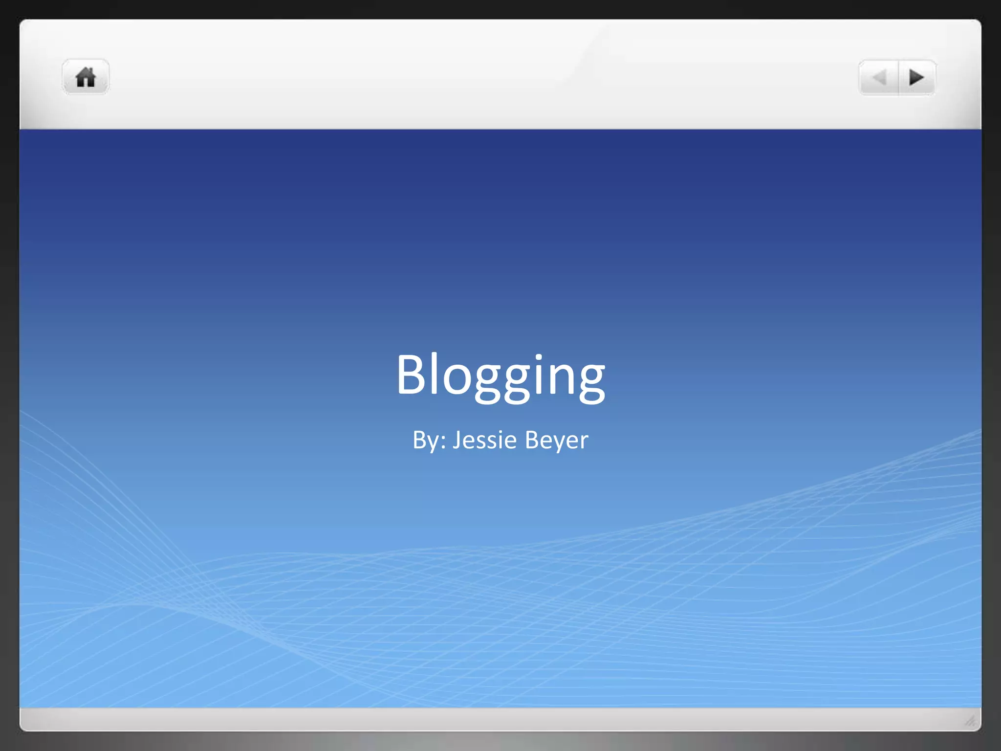 Jessie Beyer discusses her experience starting a blog and learning Photoshop. At first, she struggled to find topics for her blog but has since gotten into a groove. She enjoys using her blog as a way to share ideas with others, similar to keeping a journal. For her blog layout, Jessie chose a simple design with light orange and yellow shades. Photoshop was also new for her to learn, and she found the layer feature and editing her puppy photo to be interesting aspects to explore. Overall, Jessie feels learning these new tools of blogging and Photoshop will prove useful skills for the future.