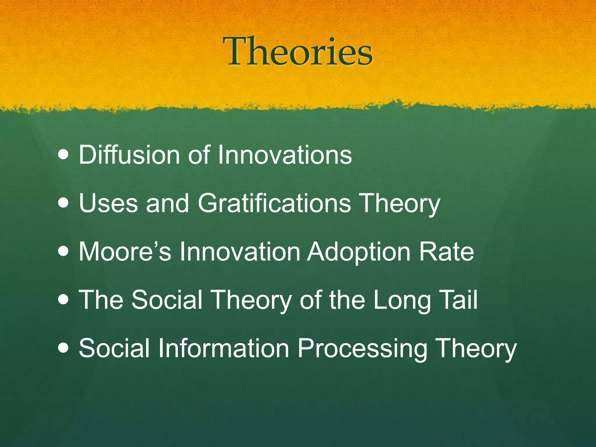 1) Diffusion of Innovations theory which explains how new technologies spread through a social system over time.