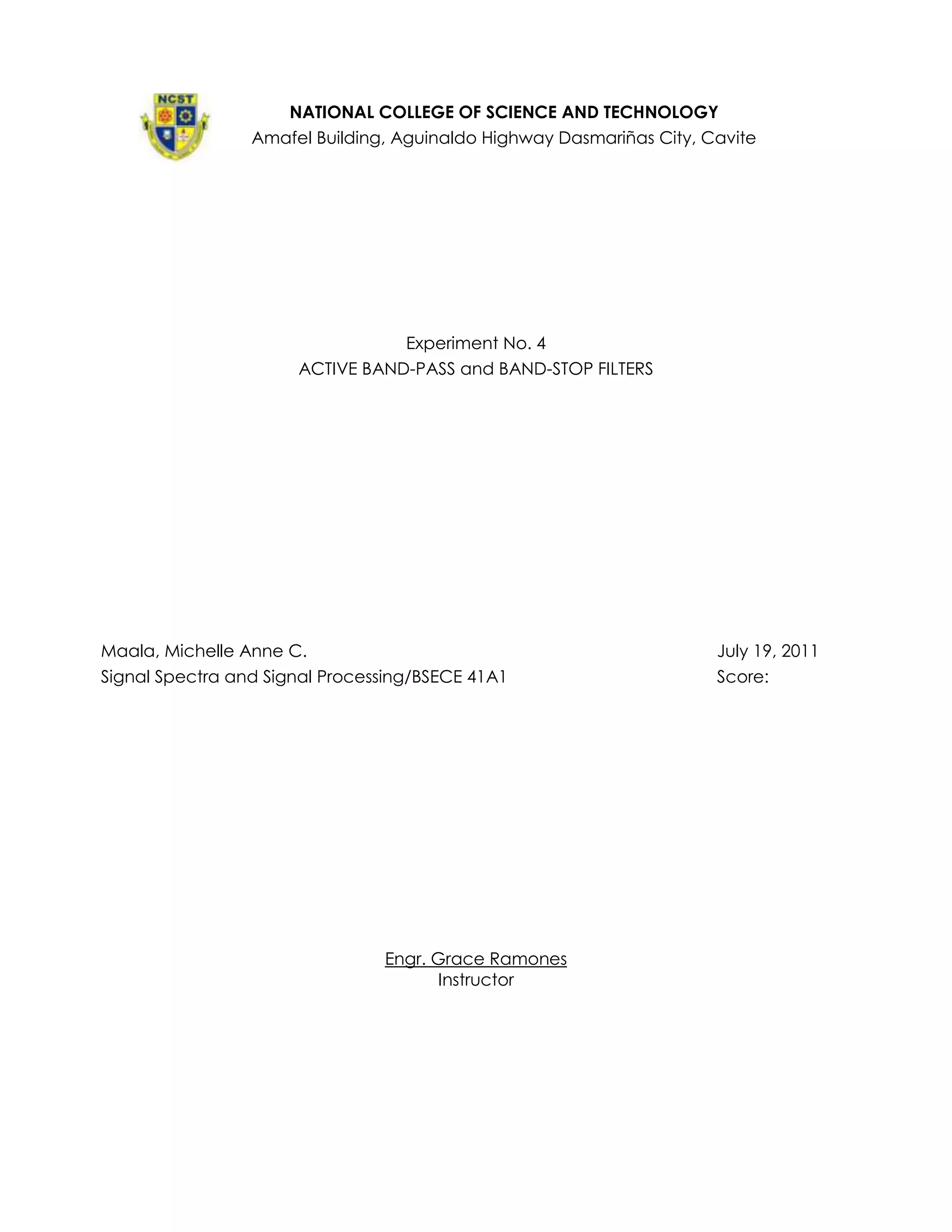 This document describes an experiment to characterize active band-pass and band-stop filters. The objectives are to measure the gain-frequency response, determine key parameters like center frequency, bandwidth and quality factor, and compare measured values to theoretical calculations. For the band-pass filter, the student measures a center frequency of 1.572 kHz, bandwidth of 0.331 kHz, and gain of 49.58, which closely match the theoretical calculations. For the band-stop filter, similar measurements and comparisons are made to characterize the filter's performance.