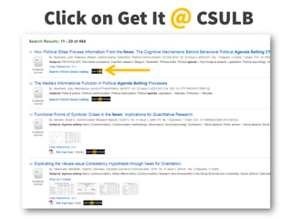 Tiffini Travis is the Communication Studies Librarian at the CSULB library. This document provides an overview of library resources and research tips. It outlines services like 5th floor study spaces, 24/7 chat and in-person help. Key terms like citations, BeachReach, and Get it @ CSULB are defined. Steps in the research process like determining keywords and databases are reviewed. The document provides guidance on searching specific databases, obtaining full-text articles, and citing sources in APA and MLA style.
