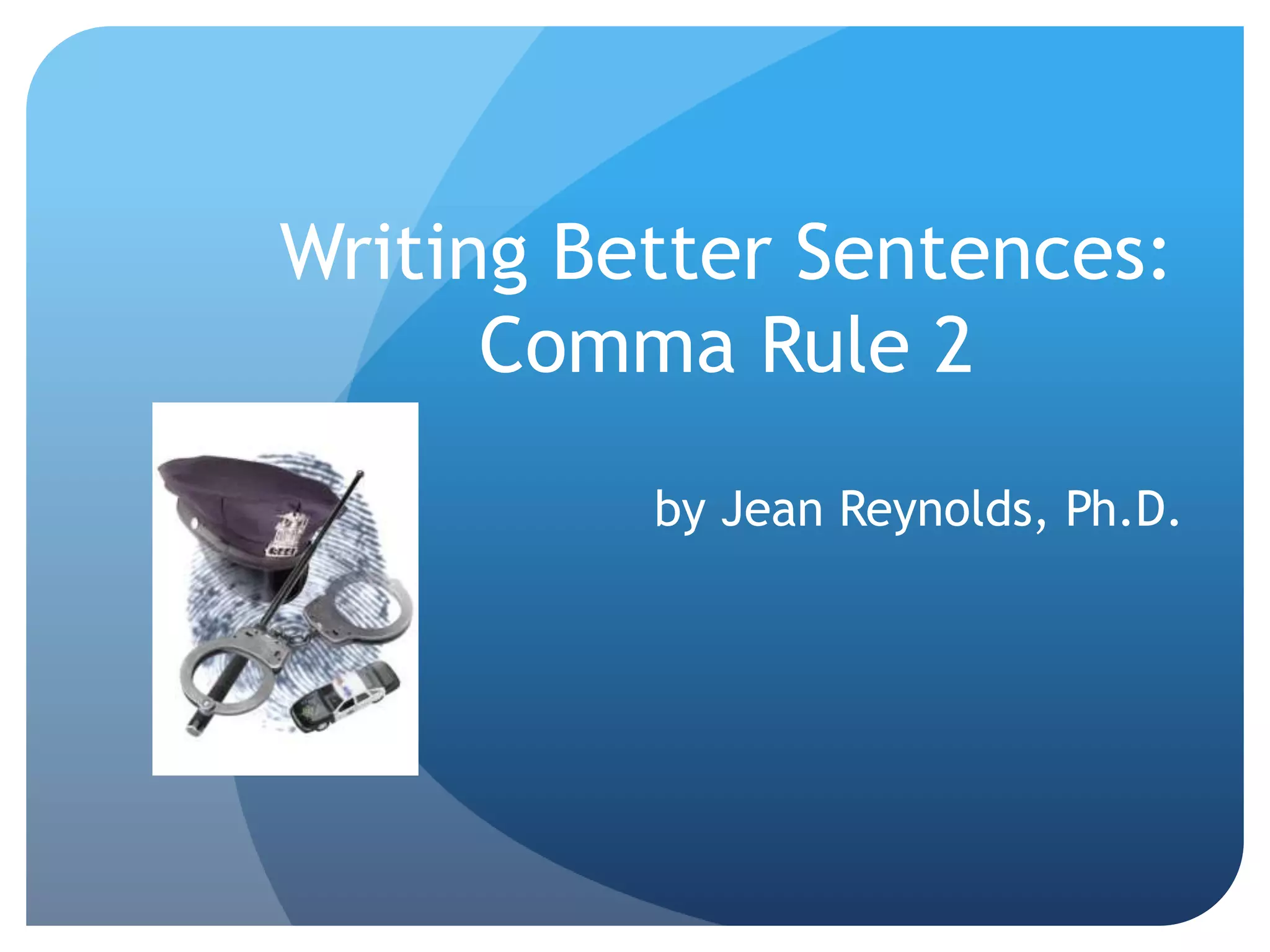 The document explains Comma Rule 2, which involves using coordinating conjunctions (the 'magnificent seven,' or FANBOYS: for, and, nor, but, or, yet, so) to join two sentences with a comma. It emphasizes the necessity of having two complete sentences for the proper use of this rule, as incorrect usage can lead to errors in writing. The author also provides resources for further learning and a book on criminal justice report writing available for purchase.