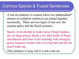 The document discusses comma splices and fused sentences, which are types of run-on sentences. A comma splice incorrectly joins two independent clauses with only a comma, while a fused sentence joins them without any punctuation. These errors can be corrected by inserting a period between the clauses, using a coordinating conjunction, changing one clause to dependent status, or inserting a conjunctive adverb between the clauses.
