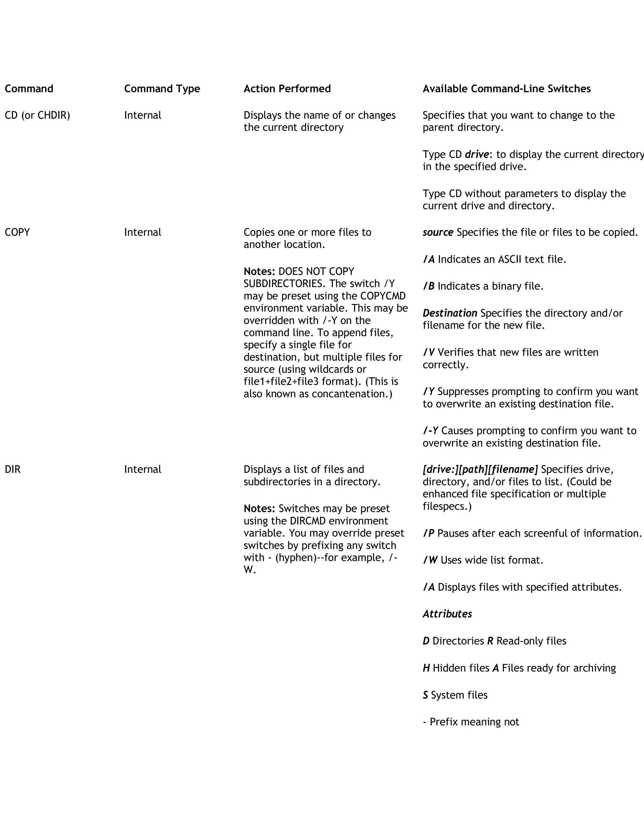 The document provides information on various DOS commands including their types (internal or external), actions performed, and available command line switches. It discusses file naming conventions in DOS/Windows including the 8.3 naming specification and long filename support. It also describes file types/formats, read only/hidden/system/archive file attributes, and the hierarchy of command execution if multiple files of the same name but different extensions exist.