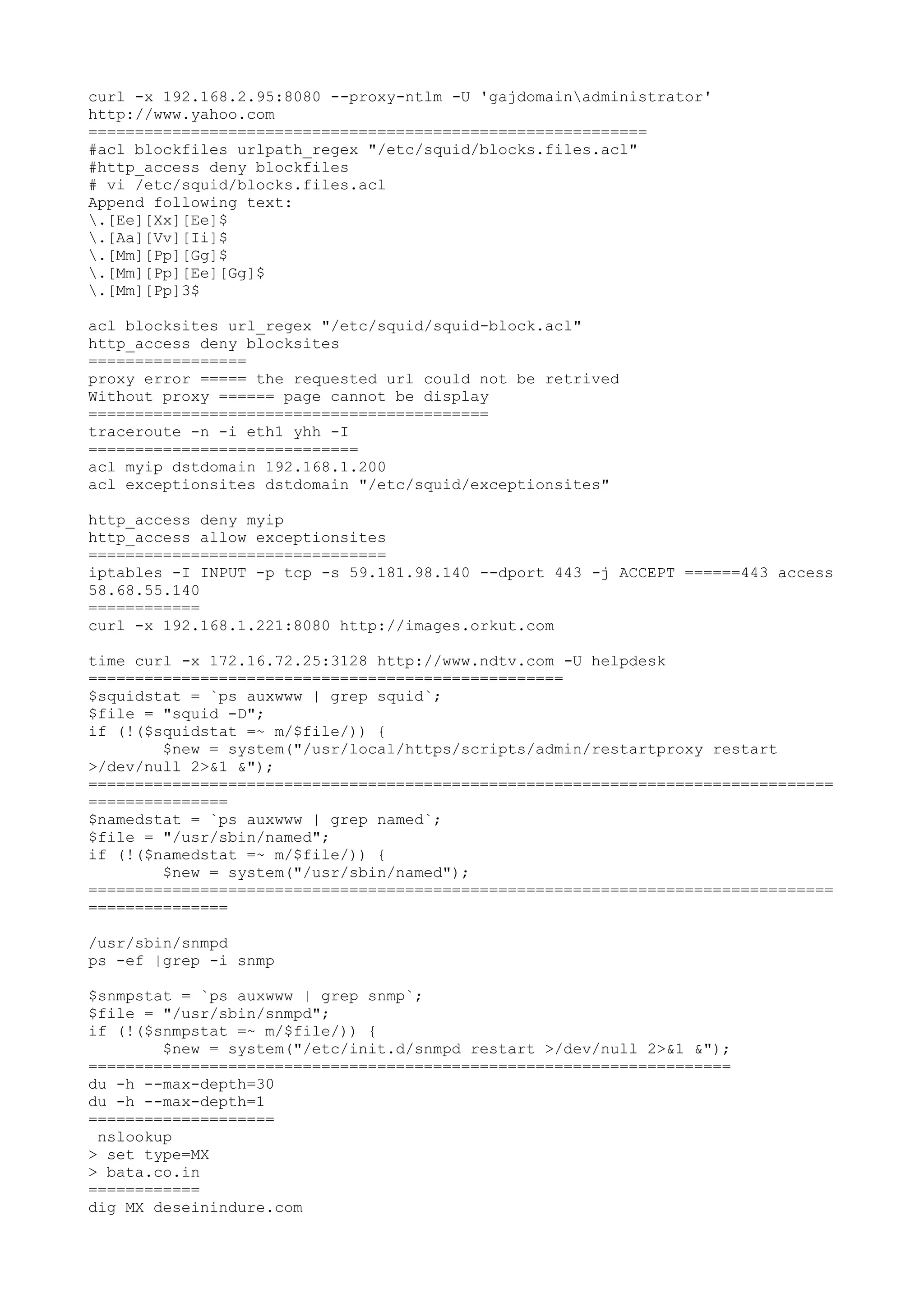 The document contains configuration commands and instructions for network services and security tools like Squid, Snort, iptables etc. It discusses configuring proxy, firewall and intrusion prevention rules to allow or block certain sites, file types and ports. It also contains commands to restart services like Squid, DNS, mail etc and check their status. System monitoring commands like ps, netstat are also included to check if processes are running.
