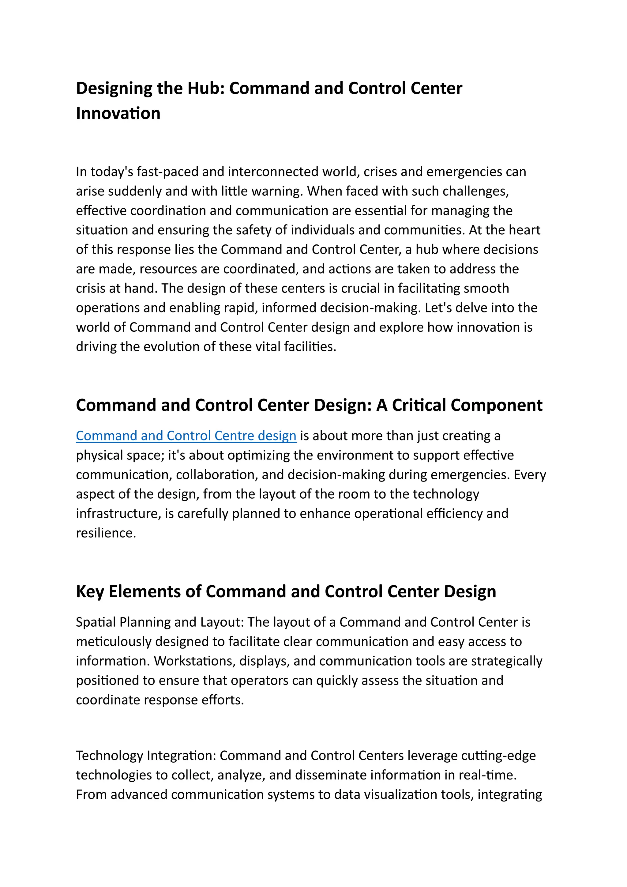 The document explores the design of command and control centers, emphasizing their importance in crisis management through effective communication and coordination. Key design elements include spatial planning, technology integration, ergonomics, and the ability to adapt to changing needs. Innovation in these centers, such as data analytics, augmented reality, and remote collaboration tools, enhances their operational efficiency and readiness to address emergencies.