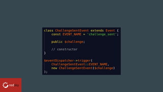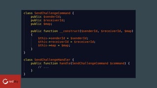 This document discusses using a command bus pattern to move code from controllers to handlers. It recommends implementing the Tactician command bus with Symfony to create thin controllers that delegate tasks to specialized handlers. Various middleware plugins are described, such as logging, transactions, and validation middleware, that can be registered to intercept and process commands. The document provides resources for learning more about command buses and Tactician.