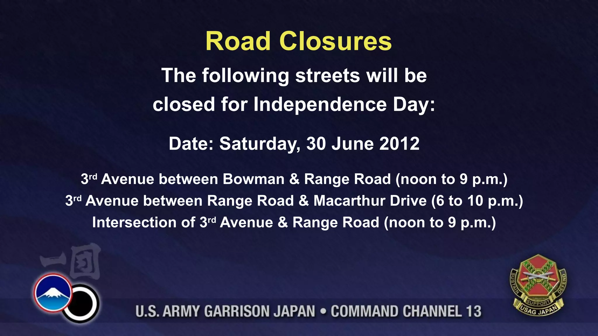 The document provides information about various road closures and events happening around Camp Zama on specific dates in June and July 2012. It announces that sections of 3rd Avenue and its intersection with Range Road will be closed on June 30th from noon to 9pm and June 6th to 10th for Independence Day events. The high school parking lot and Bldg. 1050 parking lot will also be closed on June 30th at 5am. Normal traffic will resume at 10pm. It provides contact numbers for more information.