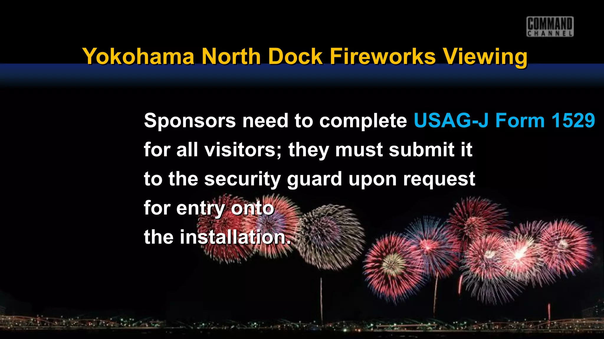 Sponsors need to complete a visitor form and submit it to security for entry to view fireworks at Yokohama North Dock. Road construction outside the Sagamihara Family Housing Area main gate will occur from July 29 to August 9, with one lane of traffic and possible congestion. The Japan Red Cross will hold a blood drive on Camp Zama on August 1 from 9:40 a.m. to 3:30 p.m. in the parking lot behind the Furniture Store.