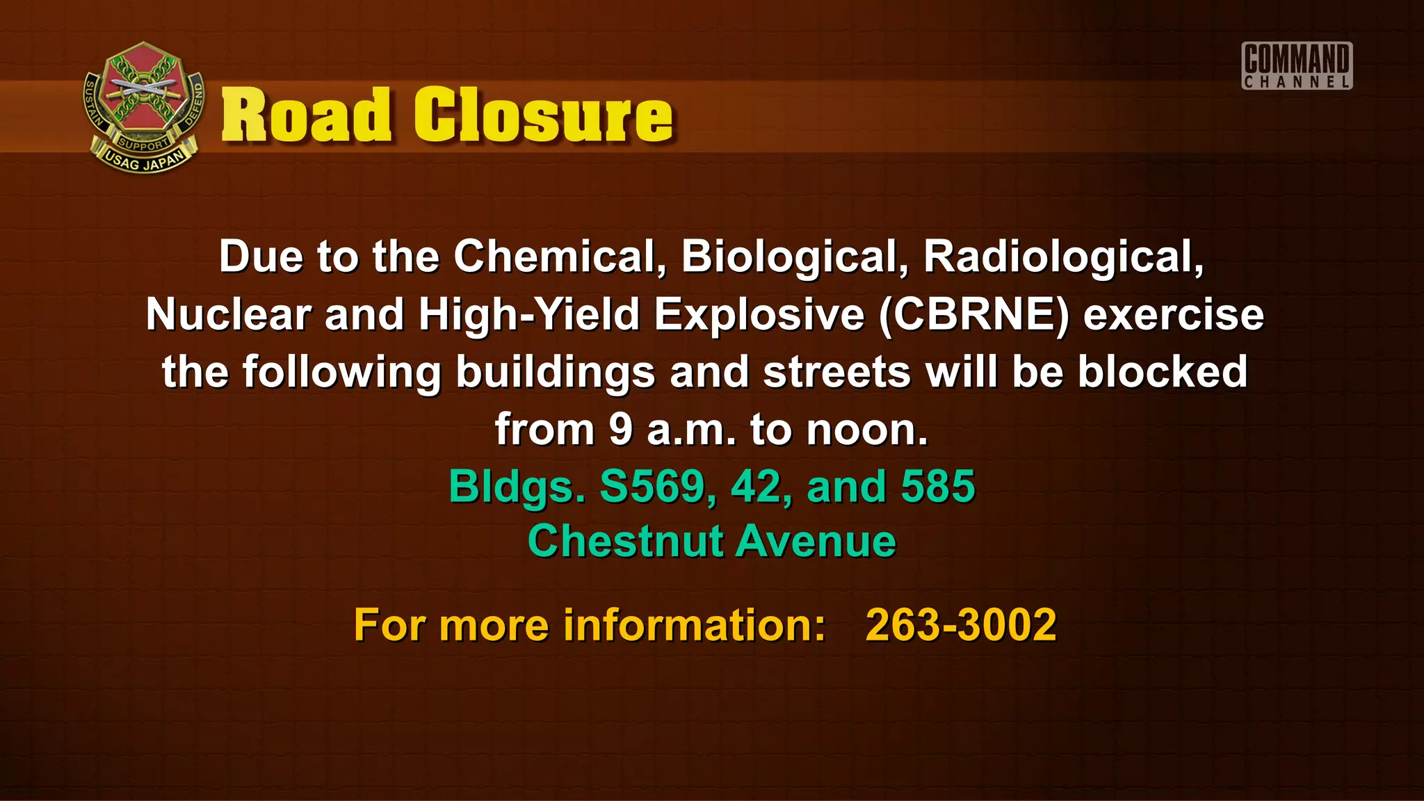 Due to a CBRNE exercise taking place from 9 a.m. to noon, buildings S569, 42, and 585 and Chestnut Avenue on Camp Zama will be blocked off during this time. For more information, call 263-3002.